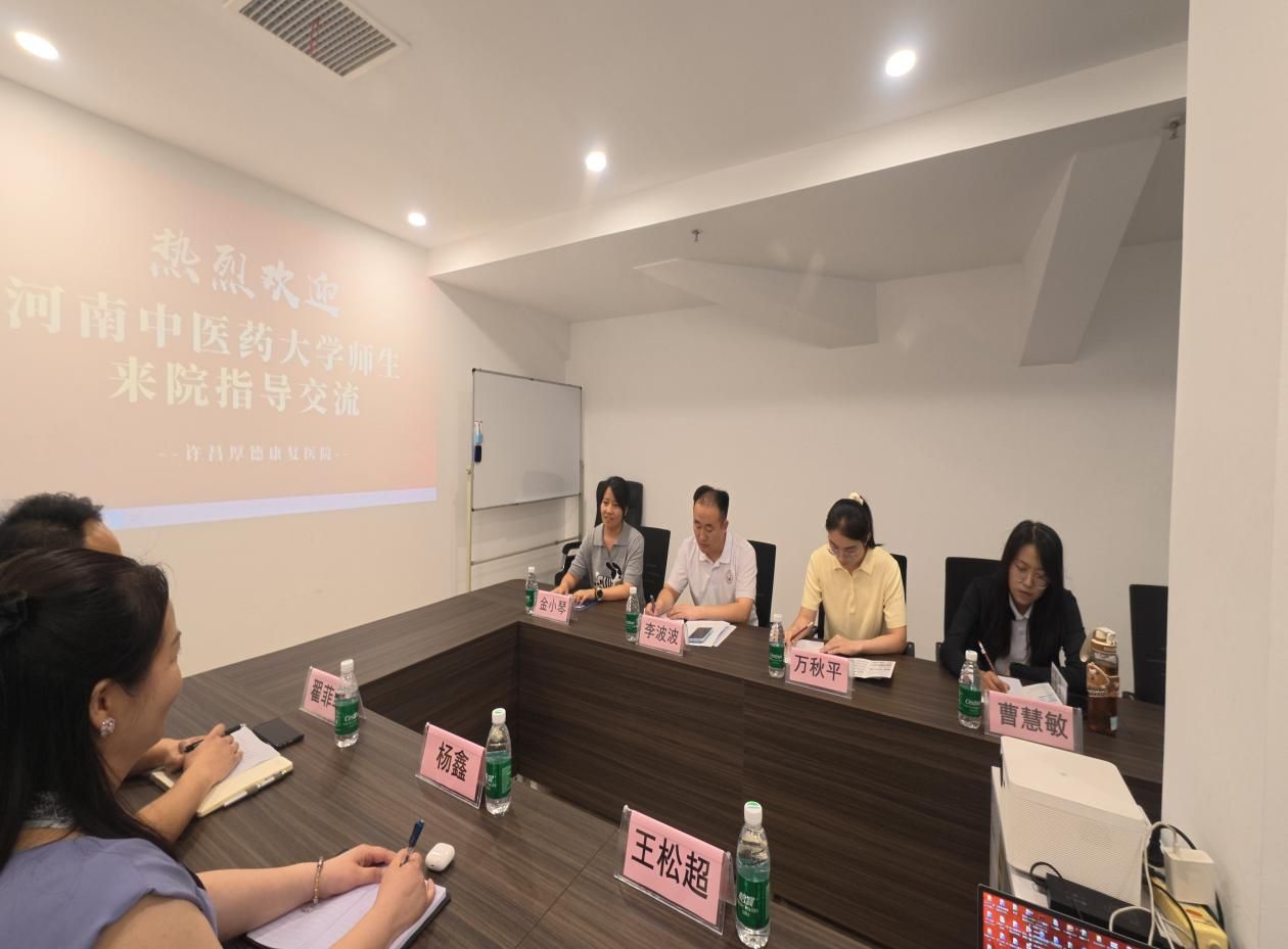 校院座谈谋对接,共话实践育人路径。7月8日下午16:00,校院双方在医院第二会议室召开实践指导对接座谈会。许昌厚德康复医院行政副院长翟菲菲、院长助理杨鑫、康复科主任、国医堂门诊主任王松超、办公室主任王颖、人力资源部主任李真,与ok138cn太阳集团古天乐金小琴、李波波、万秋平、曹慧敏等师生代表齐聚一堂,会议由王颖主任主持。翟院长首先致欢迎辞,系统介绍医院在智能康复技术应用、多学科康复诊疗体系搭建等方面的突破,强调校院合作是临床经验传承与专业人才培养的重要纽带,期待与高校优势互补、资源共享,共促康复医学发展。金小琴代表校方回应,围绕暑期实践育人目标,阐述将理论知识转化为临床能力的具体规划,提出以此次交流为契机,构建“教学-实践-反馈”闭环,推动康复医学教育与临床需求深度融合。随后,双方聚焦实践安排展开务实研讨:校方明确康复技术实训、思政教育融入等需求,院方则从住宿餐饮后勤保障到智能设备操作培训等专业支持逐项落实,为学生打造“沉浸式”实践场景,确保活动有序推进。