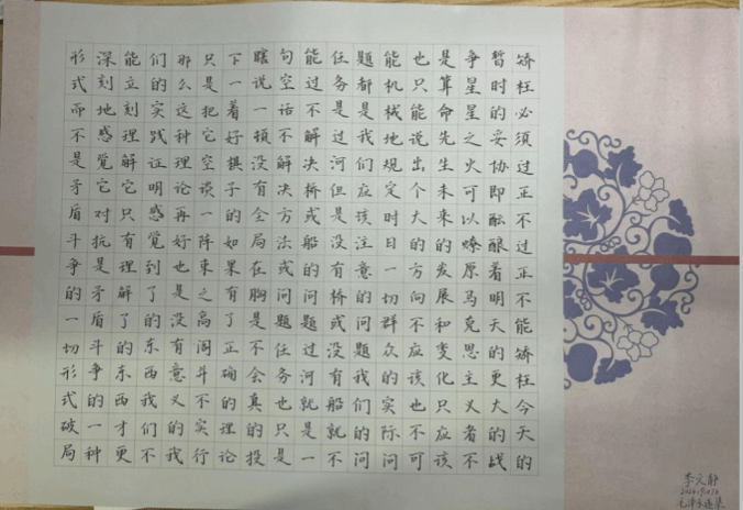书法作为中华文化的璀璨瑰宝,一撇一捺间承载着千年文脉,红色名言与经典诗词,凝聚着先辈的理想信念与民族气节。本次比赛创新主题党日活动形式,引导学子在笔墨挥洒中感悟红色精神。比赛涵盖硬笔书法与软笔书法两大类别,参赛作品围绕红色经典展开,既有《七律・长征》《沁园春・雪》等毛泽东同志的经典诗作,也有彰显民族气节、爱国情怀的名言警句。经专业评审严格遴选,本次比赛征集到大量质量上乘的参赛作品。作品风格多样、笔力遒劲,或端庄大气、或飘逸灵动,既展现了同学们扎实的书写功底和良好的艺术素养,更传递出新时代青年对传统文化的热爱与对红色精神的自觉传承。